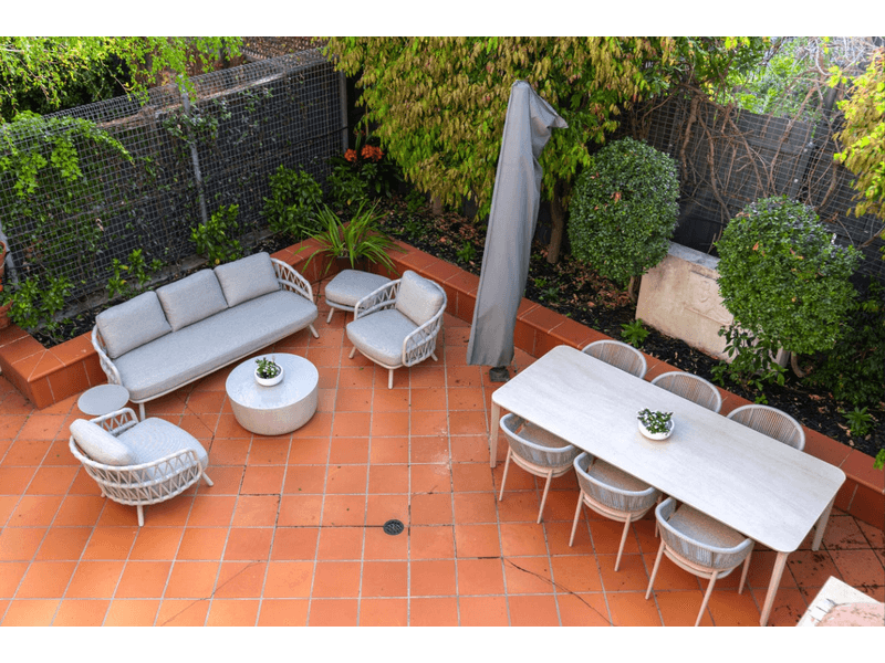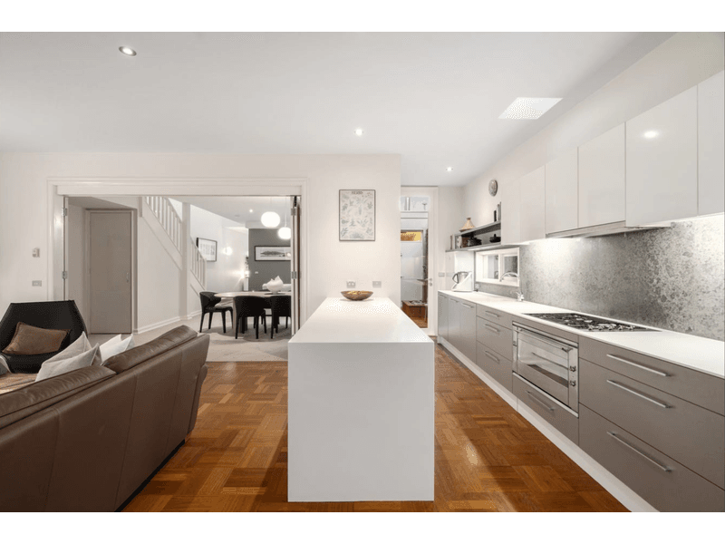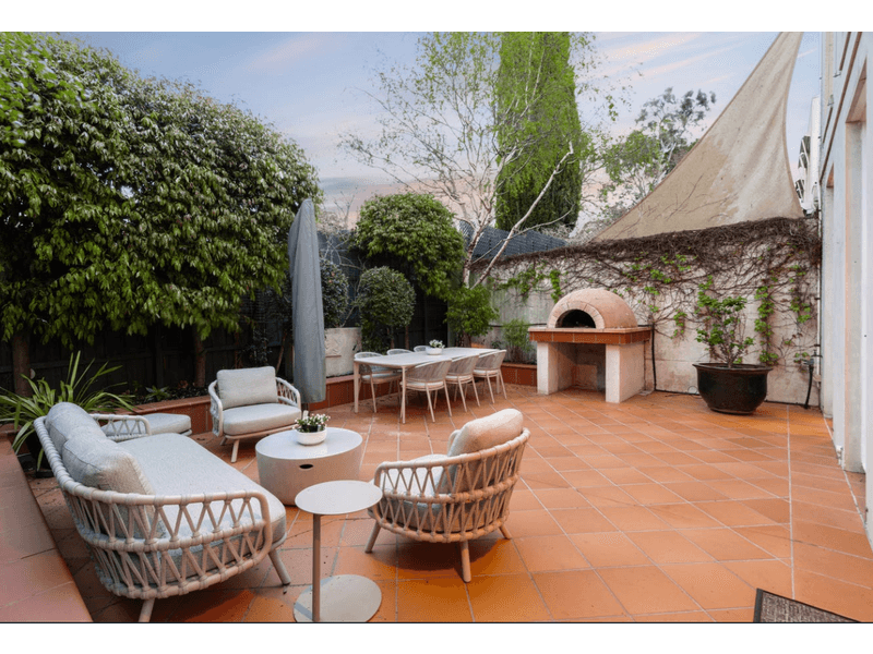High ceilings create a wonderful sense of space throughout the wide entrance hall, flowing through to a beautifully proportioned formal sitting and dining room with a gas fireplace and tranquil courtyard outlook. Rich parquetry floors enhance the expansive family living zone, which is complemented by a sleek gourmet kitchen appointed with Corian benchtops, a 90cm Smeg oven, integrated Liebherr fridge/freezer, and excellent storage. Multiple French doors open the living areas to a private, northwest-facing paved courtyard surrounded by greenery and complete with a built-in pizza oven, ideal for entertaining or relaxed outdoor living.